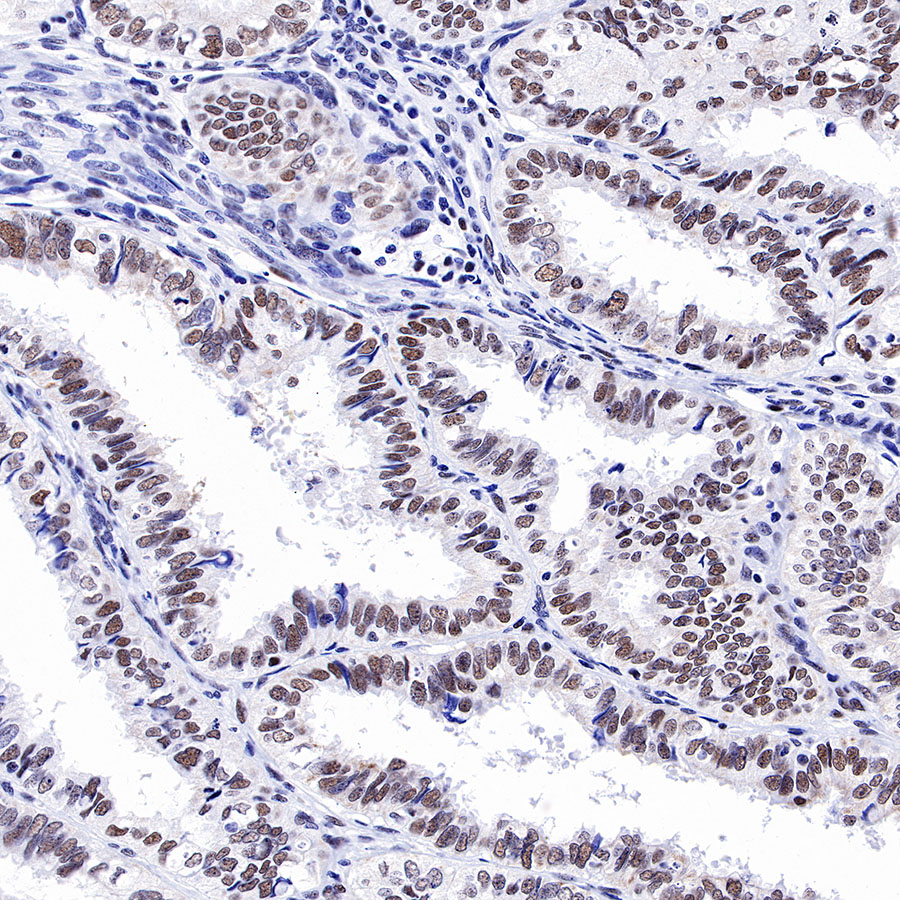 IHC shows positive staining in paraffin-embedded human endometrial cancer. Anti-MSH2 antibody was used at 1/2000 dilution, followed by a HRP Polymer for Mouse & Rabbit IgG (ready to use). Counterstained with hematoxylin. Heat mediated antigen retrieval with Tris/EDTA buffer pH9.0 was performed before commencing with IHC staining protocol.