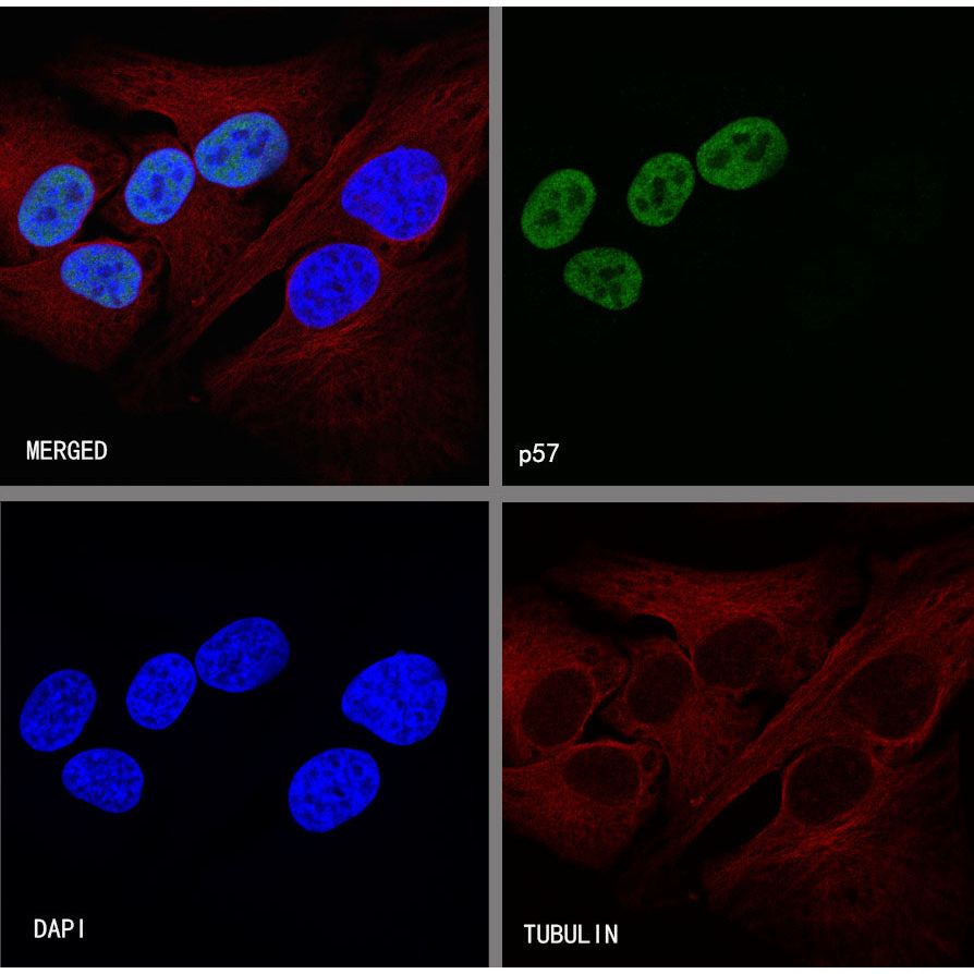 ICC shows positive staining in HeLa cells, treated with Dexamethasone(50nM, 16hr) . Anti-p57 antibody was used at 1/500 dilution (Green) and incubated overnight at 4°C. Goat polyclonal Antibody to Rabbit IgG - H&L (Alexa Fluor® 488) was used as secondary antibody at 1/1000 dilution. The cells were fixed with 4%PFA and permeabilized with 0.1% PBS-Triton X-100. Nuclei were counterstained with DAPI (Blue). Counterstain with tubulin (Red).
