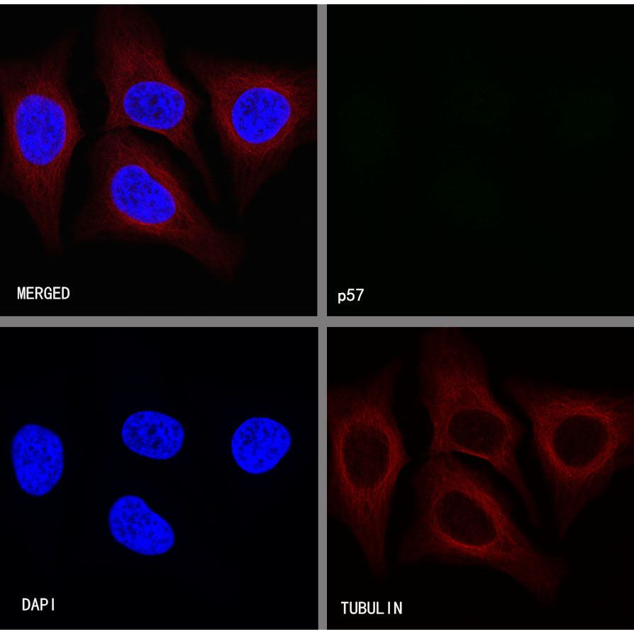 Negative control:ICC shows negative staining in HeLa cells, untreated with Dexamethasone(50nM, 16hr) . Anti-p57 antibody was used at 1/500 dilution and incubated overnight at 4°C. Goat polyclonal Antibody to Rabbit IgG - H&L (Alexa Fluor® 488) was used as secondary antibody at 1/1000 dilution. The cells were fixed with 4%PFA and permeabilized with 0.1% PBS-Triton X-100. Nuclei were counterstained with DAPI (Blue). Counterstain with tubulin (Red).