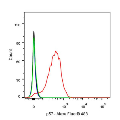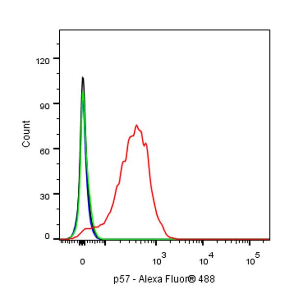 Flow cytometric analysis of 4% PFA fixed 90% methanol permeabilized HeLa (Human cervix adenocarcinoma epithelial cell) cells, treated with 50nM Dexamethasone for 16h (Red) or untreated (Green), labeling p57 at 1/500 dilution (0.1 μg) compared with a rabbit monoclonal IgG isotype control (Black) and an unlabeled control (cells without incubation with primary antibody and secondary antibody) (Blue). Goat Anti - Rabbit IgG Alexa Fluor® 488 was used as the secondary antibody.