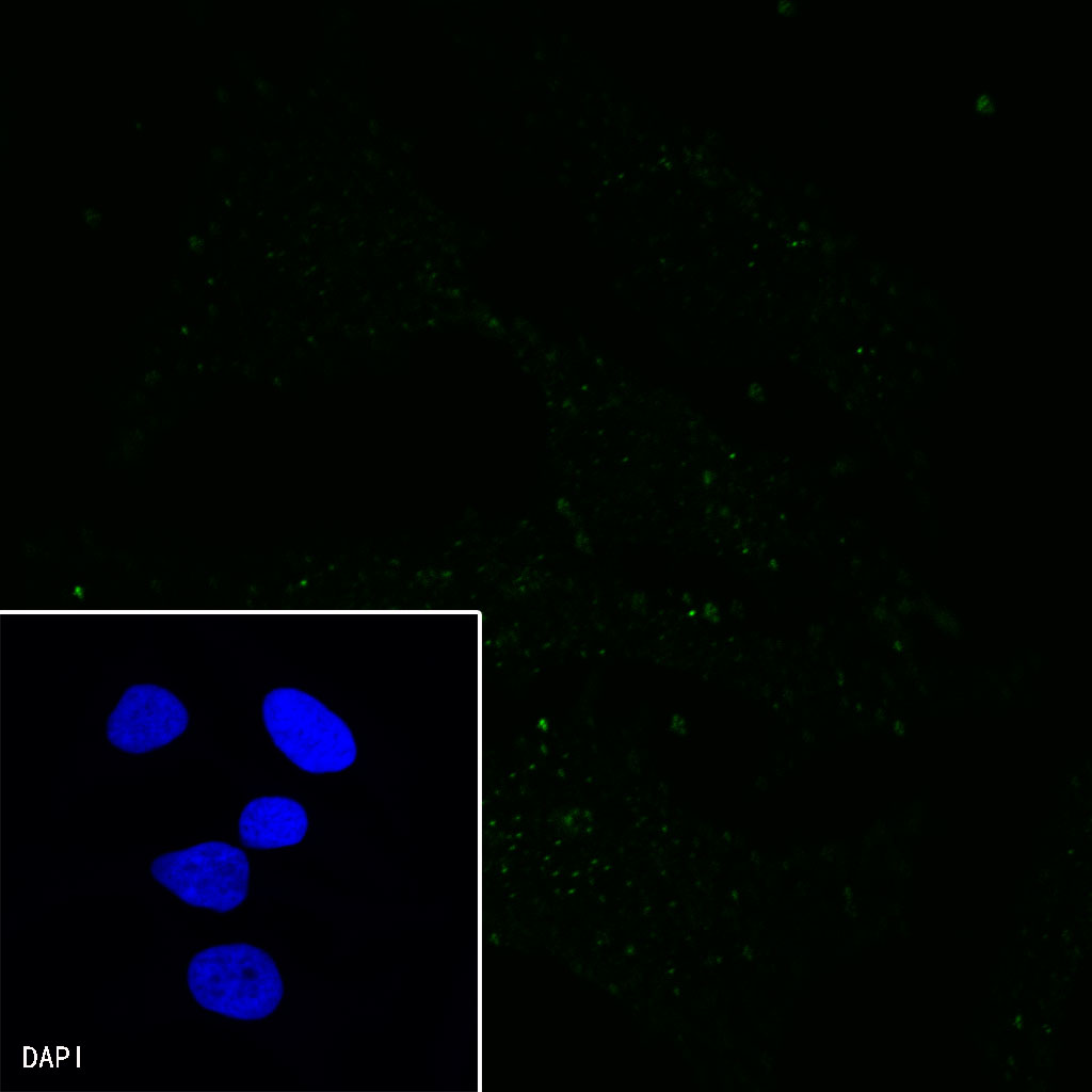 Negative control:ICC shows negative staining in HeLa cells. Anti-PMEL/Melanoma gp100 antibody was used at 1/250 dilution and incubated overnight at 4°C. Goat polyclonal Antibody to Rabbit IgG - H&L (Alexa Fluor® 488) was used as secondary antibody at 1/1000 dilution. The cells were fixed with 100% ice-cold methanol and permeabilized with 0.1% PBS-Triton X-100. Nuclei were counterstained with DAPI (Blue).