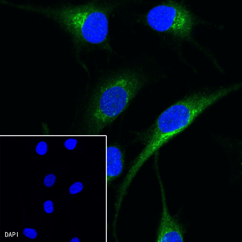 ICC shows positive staining in SK-MEL-28 cells. Anti-PMEL/Melanoma gp100 antibody was used at 1/250 dilution (Green) and incubated overnight at 4°C. Goat polyclonal Antibody to Rabbit IgG - H&L (Alexa Fluor® 488) was used as secondary antibody at 1/1000 dilution. The cells were fixed with 100% ice-cold methanol and permeabilized with 0.1% PBS-Triton X-100. Nuclei were counterstained with DAPI (Blue).