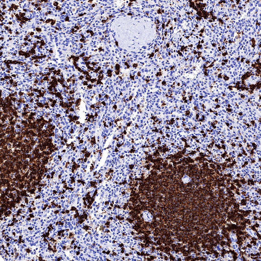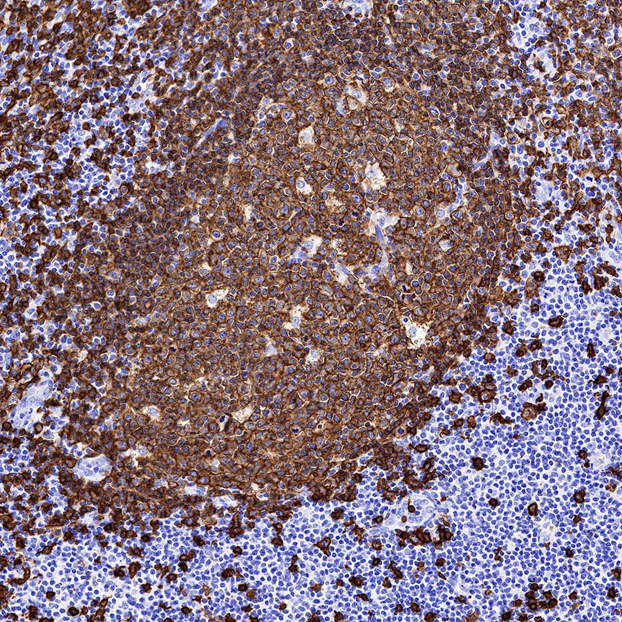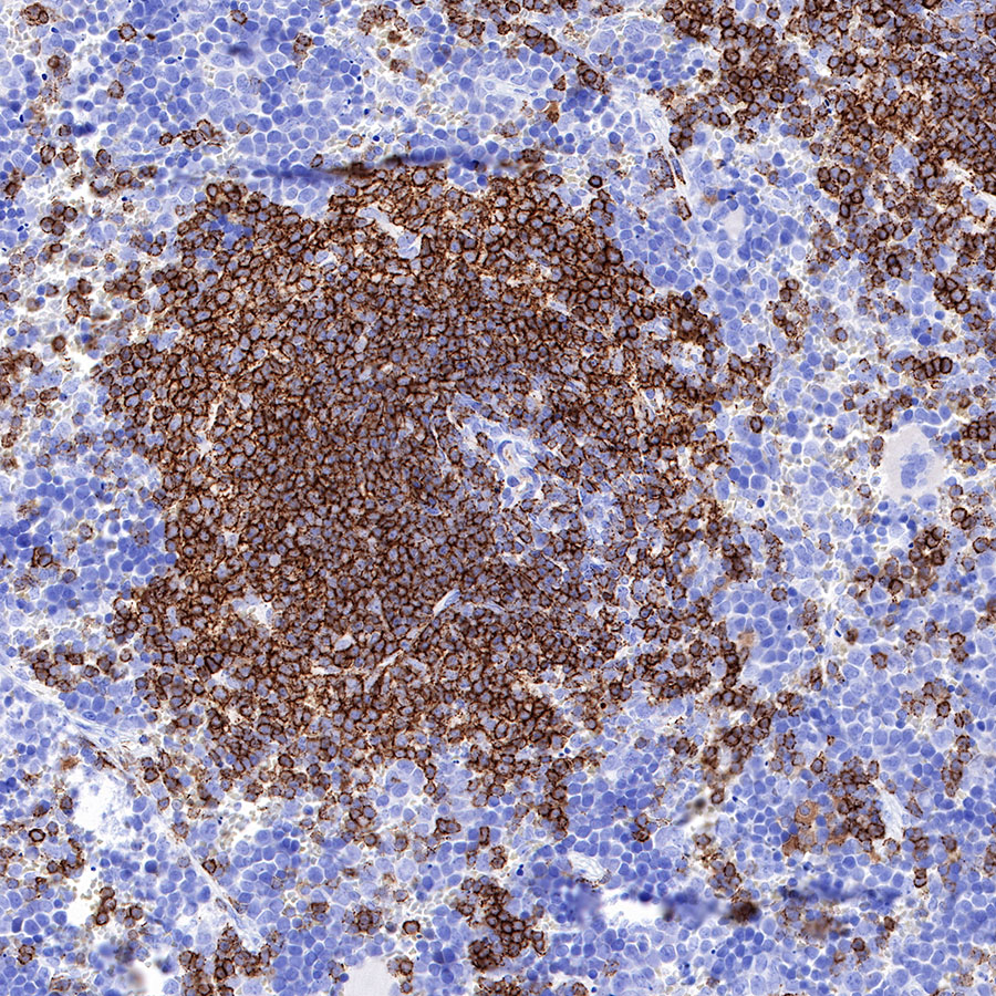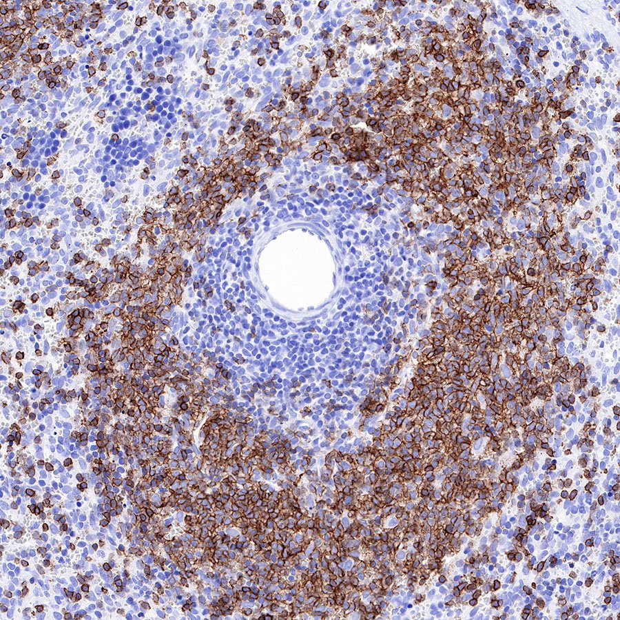 The CD20 antigen is a membrane-embedded, non-glycosylated phosphoprotein, 33-37 kDa. CD20 functions as a Ca2+-permeable cation channel, involved in the regulation of B-cell activation, proliferation and differentiation. CD20 appears on the surface of the pre-B lymphocyte between the time of light chain rearrangement and expression of intact surface immunoglobulin and is lost just before terminal B-cell differentiation into plasma cells. Surface expression of CD20 on activated B cells is approximately 4-fold greater than that found on resting B cells. CD20 is virtually specific for normal B-cells. A weak expression has been demonstrated in a subpopulation of T-cells, but not in any other cell type [NordiQC].