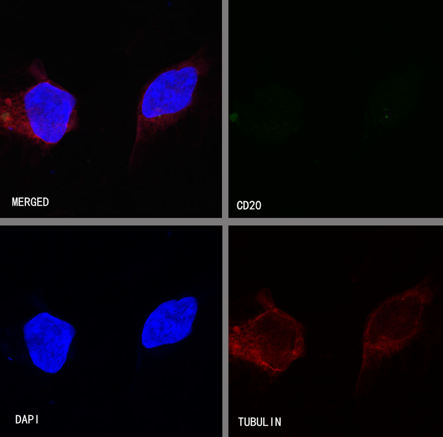Negative control:ICC shows negative staining in HEK293 cells. Anti-CD20 antibody was used at 1/250 dilution and incubated overnight at 4°C. Goat polyclonal Antibody to Rabbit IgG - H&L (Alexa Fluor® 488) was used as secondary antibody at 1/1000 dilution. The cells were fixed with 4%PFA and permeabilized with 0.1% PBS-Triton X-100. Nuclei were counterstained with DAPI (Blue).Counterstain with tubulin (Red).