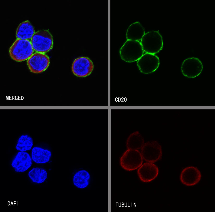 ICC shows positive staining in Ramos cells. Anti-CD20 antibody was used at 1/250 dilution (Green) and incubated overnight at 4°C. Goat polyclonal Antibody to Rabbit IgG - H&L (Alexa Fluor® 488) was used as secondary antibody at 1/1000 dilution. The cells were fixed with 4%PFA and permeabilized with 0.1% PBS-Triton X-100. Nuclei were counterstained with DAPI (Blue).Counterstain with tubulin (Red).
