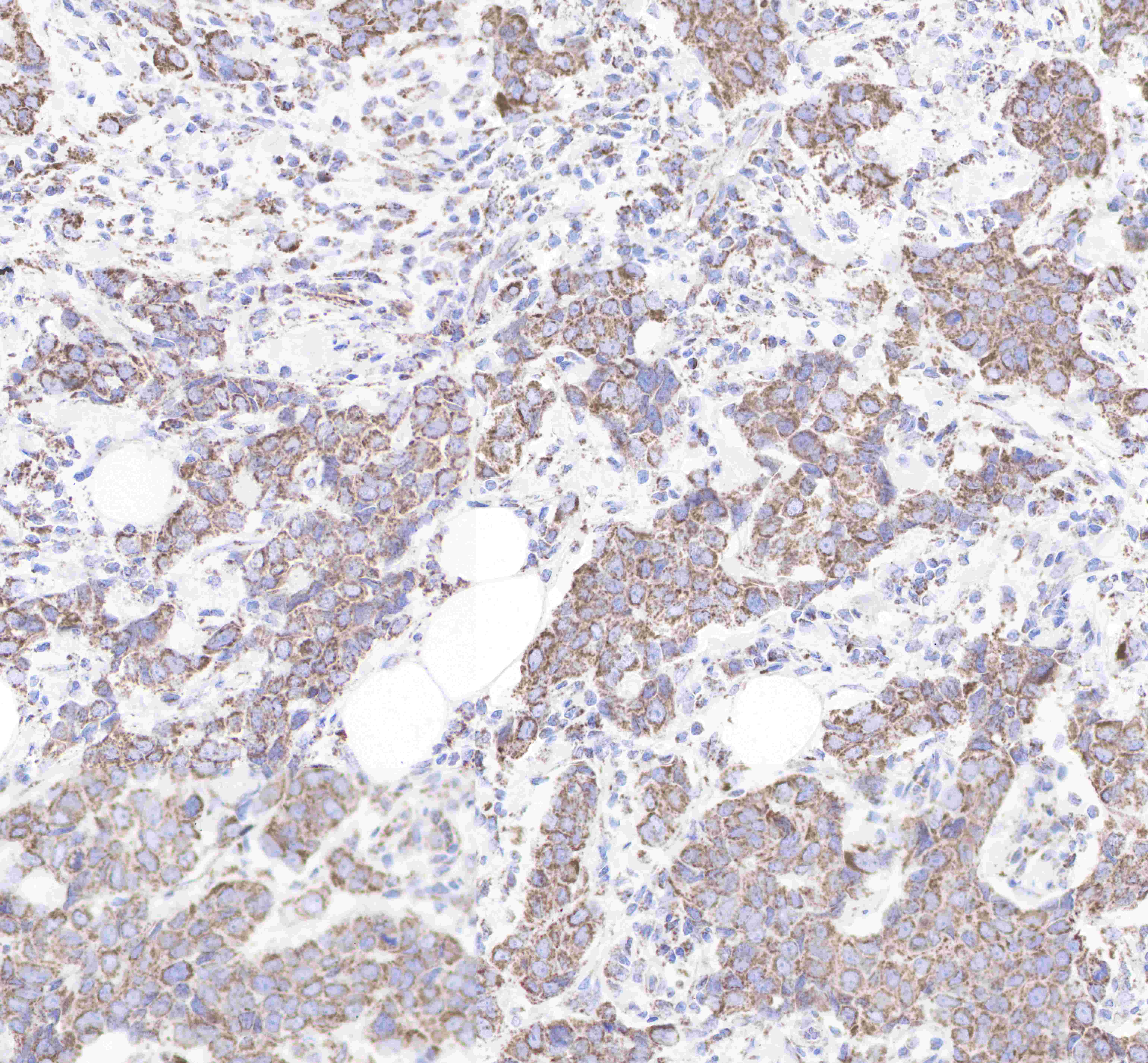 IHC shows positive staining in paraffin-embedded human breast cancer.