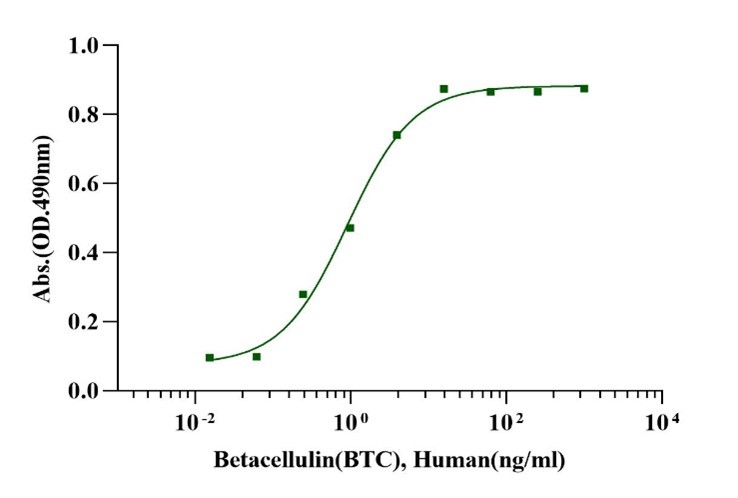 Betacellulin (BTC) is a member of the epidermal growth factor (EGF) family. Betacelluli is expressed in most tissues including kidney, uterus, liver and pancreas. It is also present in body fluids, including serum, milk, and colostrum. It is synthesized primarily as a transmembrane precursor, which is then processed to a mature molecule by proteolytic events. Betacellulin signals through the EGF receptor.