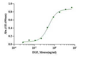 Epidermal Growth Factor (EGF) is a potent growth factor that stimulates the proliferation of various epidermal and epithelial cells. EGF binds to epidermal growth factor receptor and stimulates an intracellular signal transduction cascade, leading to activation of genes that regulate cell proliferation, angiogenesis, motility, and metastasis. EGF mRNA and protein are expressed in a number of adult tissues, especially in epithelial cells in the gastrointestinal tract. Predominant sites of synthesis of this peptide are the submandibular glands, the Brunner glands in the small intestine and the kidney.