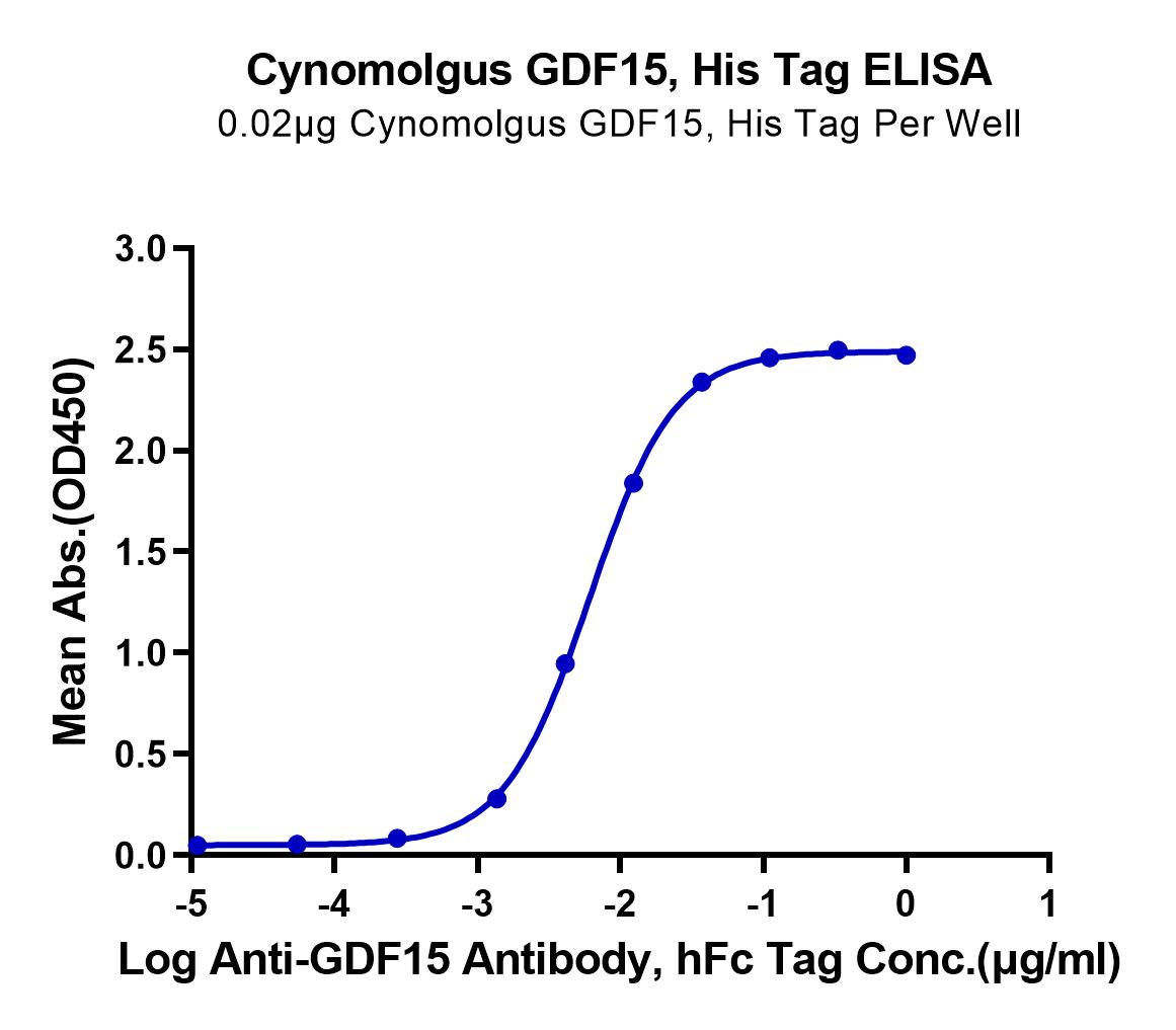 Immobilized Cynomolgus GDF15, His Tag at 0.2 μg/ml (100 μl/well) on the plate. Dose response curve for Anti-GDF15 Antibody, hFc Tag with the EC50 of 6.1 ng/ml determined by ELISA.
