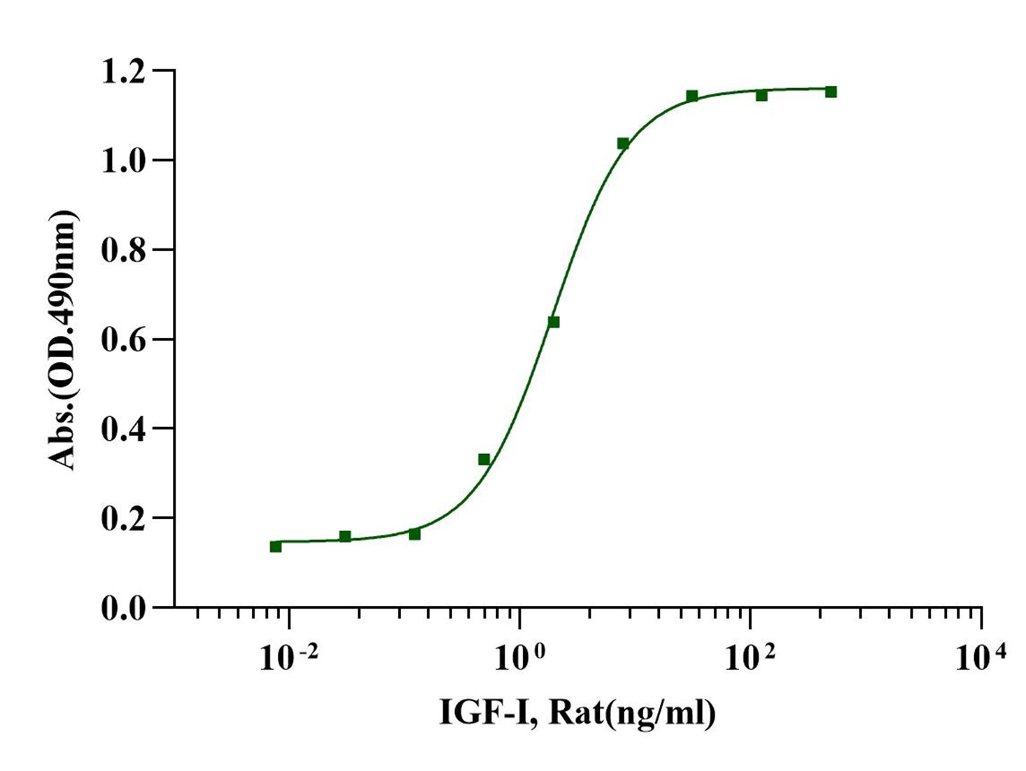 Insulin-like growth factor I (IGF-I) belongs to the family of insulin-like growth factors that are structurally homologous to proinsulin. Mature IGFs are generated by proteolytic processing of inactive precursor protein containing N-terminal and C-terminal propeptide regions. IGF-I is produced primarily by the liver as an endocrine hormone as well as in target tissues in a paracrine/autocrine fashion. The production of IGF-I is stimulated by growth hormone (GH) and can be retarded by undernutrition, growth hormone insensitivity, lack of growth hormone receptors, or failures of the downstream signaling pathway post GH receptor including SHP2 and STAT5B. IGF-I binds IGF-1R, IGF-2R, and the insulin receptor and plays a key role in cell cycle progression, cell proliferation and tumor progression. Accession#: P08025 https://www.uniprot.org/uniprotkb/ P08025 /entry