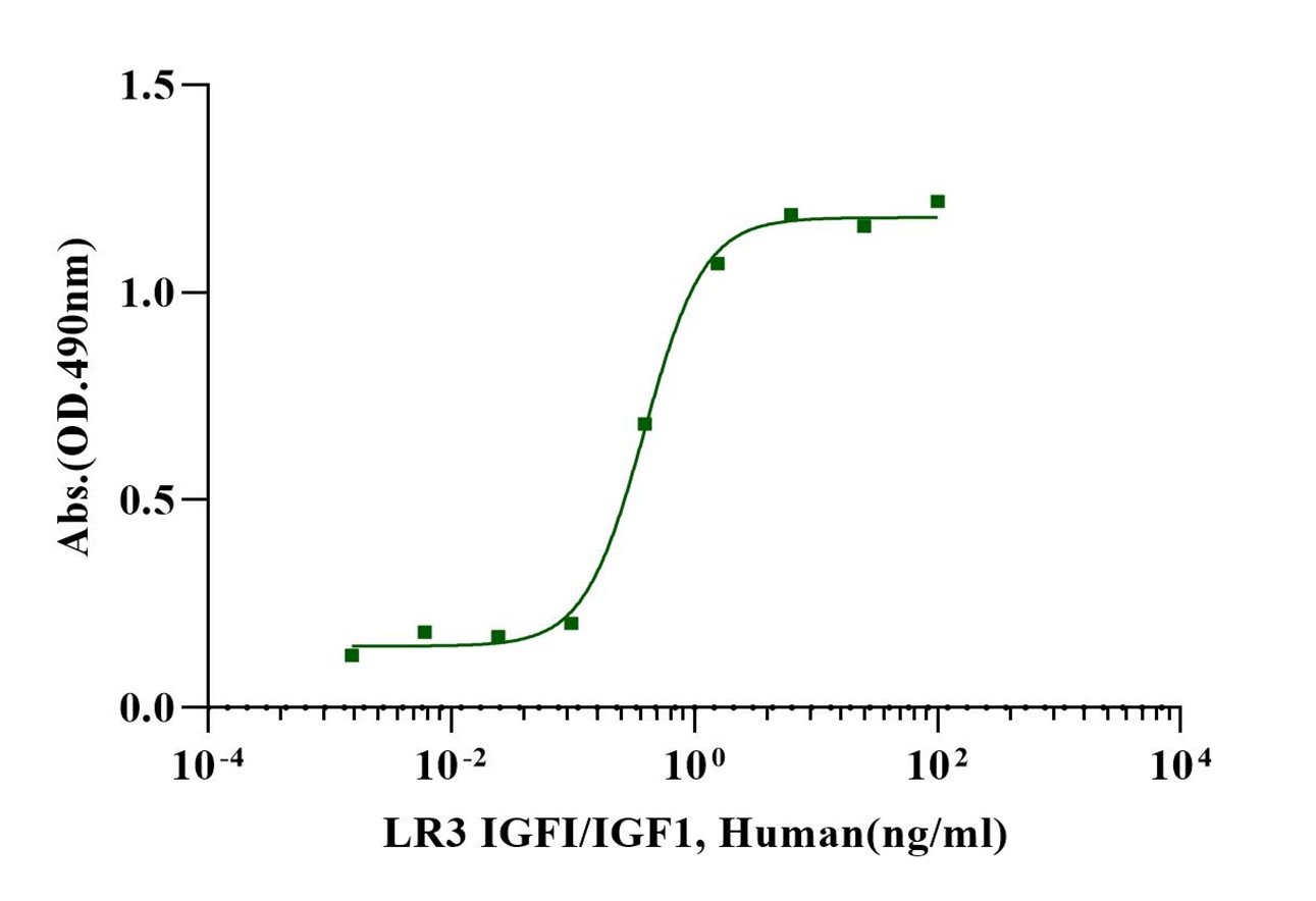 IGF-I is a well-characterized basic peptide secreted by the liver that circulates in the blood. It has growth-regulating, insulin-like, mitogenic activities. IGF-I is a growth factor that has a major, but not absolute, dependence on somatotropin. It is believed to be mainly active in adults in contrast to IGF-II, which is also a major fetal growth factor. Human Long R3 Insulin-like Growth Factor-I (rhLR3-IGF-I) contains an 83 amino acid analog of human IGF-I. Compared to the complete human IGF-I sequence, an addition of the rhLR3-IGF-1 includes the substitution of an Arg for the Glu at position 3 (hence R3) and a13 amino acid extension peptide at the N-terminus. An enhanced potency is due to the markedly decreased binding of human Long R3-IGF-I to IGF binding proteins which normally inhibit the biological actions of IGFs.
