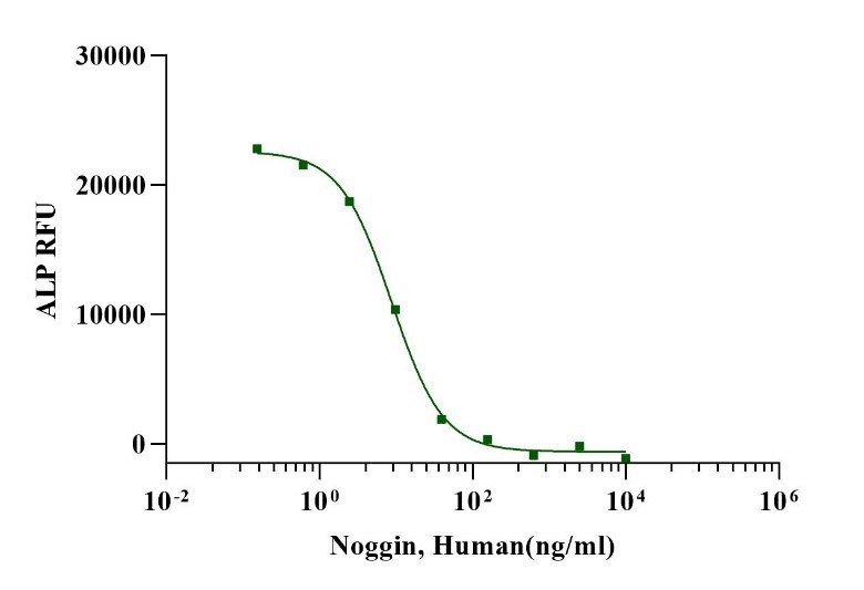 Noggin is a 67 kD homodimeric glycoprotein, which was the first BMP antagonist to have its crystallographic structure resolved at high resolution. The Noggin structure shares with that of its BMP ligands, the TGF-β cytokine superfamily fold of a cystine-knot domain, containing two β-strand finger-like loops. Noggin exists as a dimer of identical subunits and resembles a flat “butterfly-like” shape with the helical regions of the two subunits in close contact with each other as the body of the butterfly, and the β-strands of each subunit projecting outward as wings in parallel with each other, and at some 45° away from the axis of symmetry of the dimer. In mice heterozygous for Noggin gene deletion, various skeletal abnormalities arise due to cartilage hyperplasia and failures to initiate joint formation. All these abnormalities may be attributed to inadequate attenuation of BMP activity in the affected tissues. Noggin has been reported to be a specific inhibitor of BMP activity in mesenchymal cells. Noggin regulates the response of undifferentiated cells to BMPs through a negative feedback mechanism that maintains the cells in an undifferentiated state, thus controlling the rate of cell growth. The suggested mechanism of inhibition is based on the binding of Noggin to BMPs, which prevents them from interacting with cell surface receptors. Because of the feedback process, the BMPs in turn induce the mesenchymal cells to express Noggin. Once the process of cell differentiation and proliferation is activated, the production of Noggin is reduced. Noggin has various activities of relevance to potential future regenerative strategies for neurological disorders and injury. Administration of recombinant Noggin has been reported to improve brain recovery from ischemic injury by promoting microglia activation. Beyond regulating the fate of neural cells, Noggin has been shown to be a potent inducer of adipocyte formation in mesenchymal stem cell cultures.