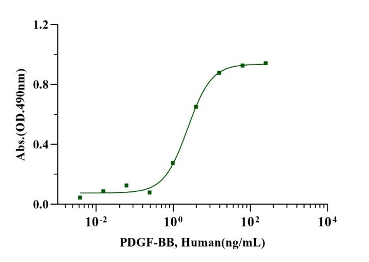 Platelet-derived growth factor (PDGF) is a family of three disulfide-linked glycoprotein dimers of M.W. 29kDa-32kDa that arise from astochastic assembly of the homologous subunits, A-chain and B-chain, yielding the heterodimer PDGF-AB and homodimers PDGF-AA and PDGF-BB. The B-chain contains a cationic carboxyl terminus that has been implicated in the strong association of PDGF-BB with the cell surface and wound healing.