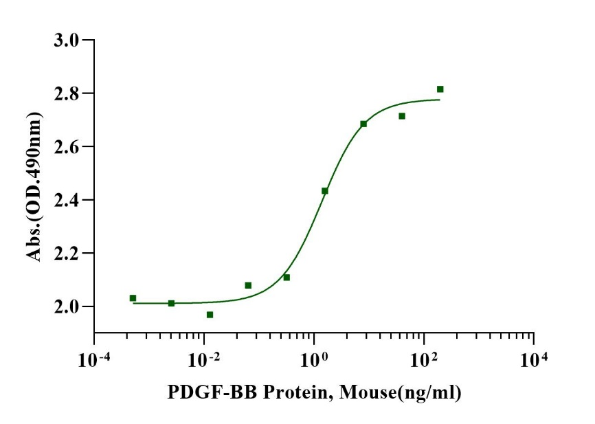 Platelet-derived growth factor BB (PDGF-BB) is a member of the PDGF family of growth factors that play a crucial role in cell proliferation, migration, and angiogenesis. PDGF-BB is a homodimeric protein that is released by platelets, macrophages, and endothelial cells in response to tissue injury or inflammation. It acts by binding to its receptors, PDGFR-α and PDGFR-β, leading to the activation of downstream signaling pathways involved in cell growth and tissue repair. PDGF-BB is involved in various physiological processes, such as wound healing, tissue regeneration, and vascular development, as well as in pathological conditions, including fibrosis, atherosclerosis, and cancer.