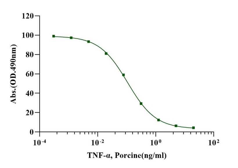 Tumor necrosis factor alpha (TNF-alpha), also known as cachectin and TNFSF2, is the prototypic ligand of the TNF superfamily. It is a pleiotropic molecule that plays a central role in inflammation, immune system development, apoptosis, and lipid metabolism. Porcine TNF-alpha consisits of a 35 amino acid (aa) cytoplasmic domain, a 21 aa transmembrane segment, and a 176 aa extracellular domain (ECD). Within the ECD, porcine TNF-alpha shares 69%-86% aa sequence identity with bovine, canine, cotton rat, equine, feline, human, mouse, rat, and rhesus TNF-alpha . TNF-alpha is produced by a wide variety of immune, epithelial, endothelial, and tumor cells. TNF-alpha is assembled intracellularly to form a noncovalently linked homotrimer which is expressed on the cell surface. Cell surface TNF-alpha can induce the lysis of neighboring tumor cells and virus infected cells, and it can generate its own downstream cell signaling following ligation by soluble TNFR I. Shedding of membrane bound TNF-alpha by TACE/ADAM17 releases the bioactive cytokine, a 55 kDa soluble trimer of the TNF-alpha extracellular domain. TNF-alpha binds the ubiquitous 55-60 kDa TNF RI and the hematopoietic cell-restricted 80 kDa TNF RII, both of which are also expressed as homotrimers. Both type I and type II receptors bind TNF-alpha with comparable affinity, although only TNF RI contains a cytoplasmic death domain which triggers the activation of apoptosis. Soluble forms of both types of receptors are released and can neutralize the biological activity of TNF-alpha.