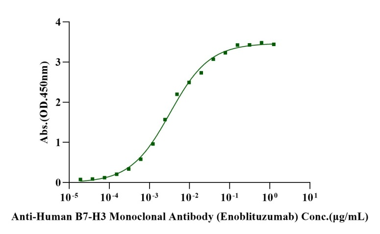 Immobilized B7-H3/CD276 His Tag, Human(Cat. No. UA010010) at 2.0μg/mL (100μL/well) can bind Anti-Human B7-H3 Monoclonal Antibody (Enoblituzumab)with EC50 of 2.81-3.81 ng/mL.