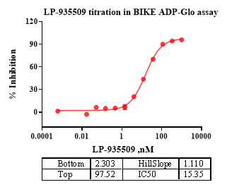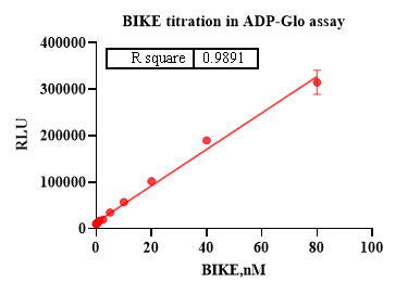 The BIKE activity was detected using Ultra Luminescence technology. The reaction was performed by incubating the BIKE protein , ATP and substrate at 25℃ for 120 min, then adding ADP-Glo reagent and reading RLU with BMG.