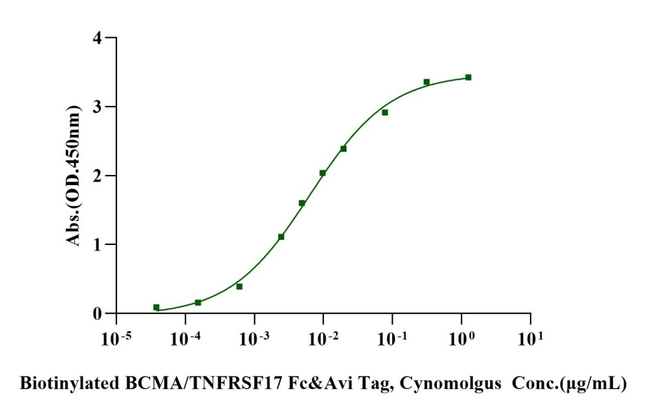Immobilized Anti-Human BCMA Monoclonal Antibody (Belantamab) at 2.0μg/mL (100μL/well) can bind Biotinylated BCMA/TNFRSF17 Fc&Avi Tag, Cynomolgus (Cat. No. UA010761)with EC50 of 5.07-8.15ng/mL.
