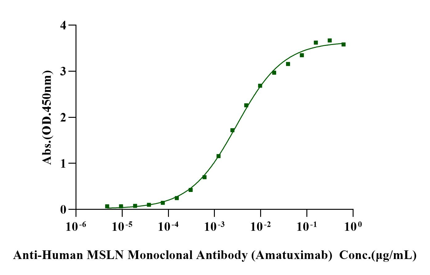 Immobilized Biotinylated MSLN His&Avi Tag, Human (Cat. No. UA010438) at 2 μg/mL on Streptavidin precoated (0.5μg/well) plate, can bind Anti-Human MSLN Monoclonal Antibody (Amatuximab) with EC50 of 2.66-3.45 ng/ml.