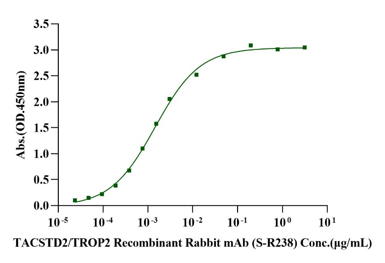 Immobilized Biotinylated TROP2 His&Avi Tag Protein, Human (Cat. No. UA010823) at 2.0μg/mL (100μL/well) on Streptavidin precoated (0.5μg/well) plate, can bind TACSTD2/TROP2 Recombinant Rabbit mAb (S-R238) (Cat. No. S0B0324)with EC50 of 1.24-1.70ng/mL.
