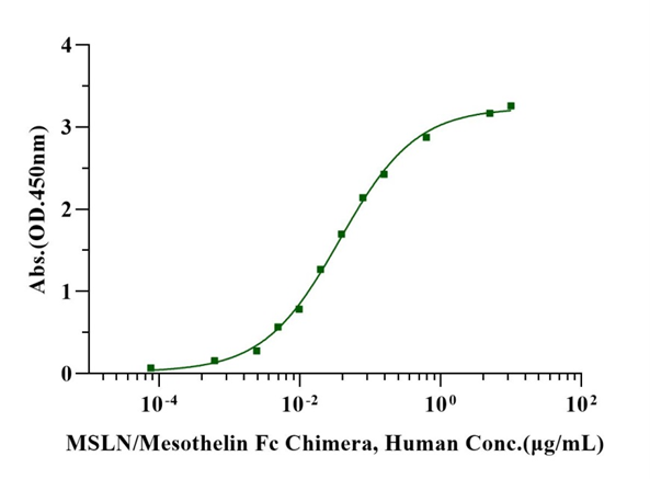 Immobilized CA125/MUC16 His Tag, Human (Cat. No. UA010258) at 2.0μg/mL (100μL/well) can bind MSLN/Mesothelin Fc Chimera, Human (Cat. No. UA010184) with EC50 of 0.031-0.043μg/ml.