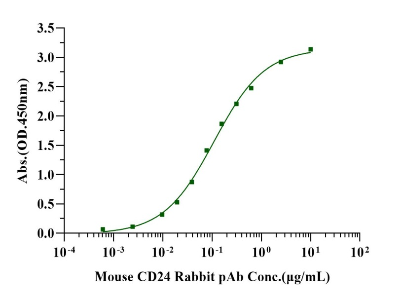 Immobilized CD24 Fc Chimera Protein, Mouse (Cat. No. UA010962) at 2.0μg/mL (100μL/well) can bind Mouse CD24 Rabbit pAb with EC50 of 0.091-0.14 μg/mL.