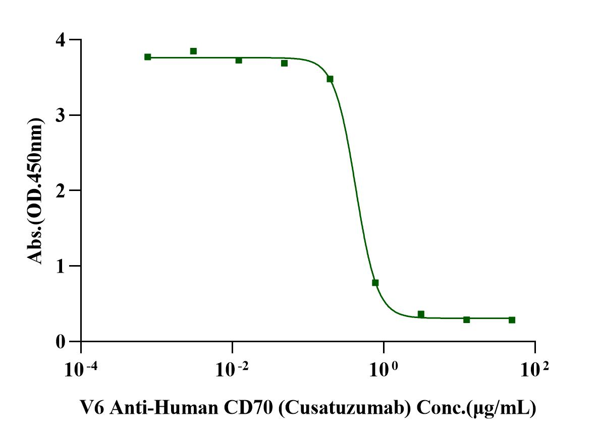 Serial dilutions of V6 Anti-Human CD70 (Cusatuzumab) were added into CD27 Ligand / CD70 Fc Tag,His tag, Trimer design Human (Cat. No. UA011141): Biotinylated CD27/TNFRSF7 His Tag Protein, Human binding reactions. The half maximal inhibitory concentration (IC50) is 0.44 μg/mL.