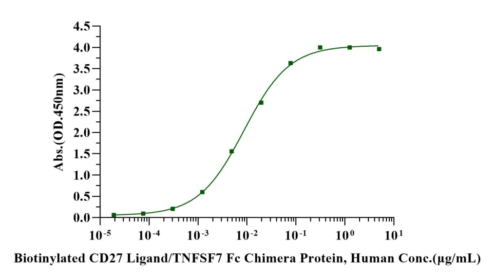 Immobilized CD27/TNFRSF7 Fc Chimera Protein, Human (Cat. No. UA010395) at 2.0μg/mL (100μL/well) can bind Biotinylated CD27 Ligand/TNFSF7 Fc Chimera Protein, Human with EC50 of 7.51-10.09 ng/ mL.