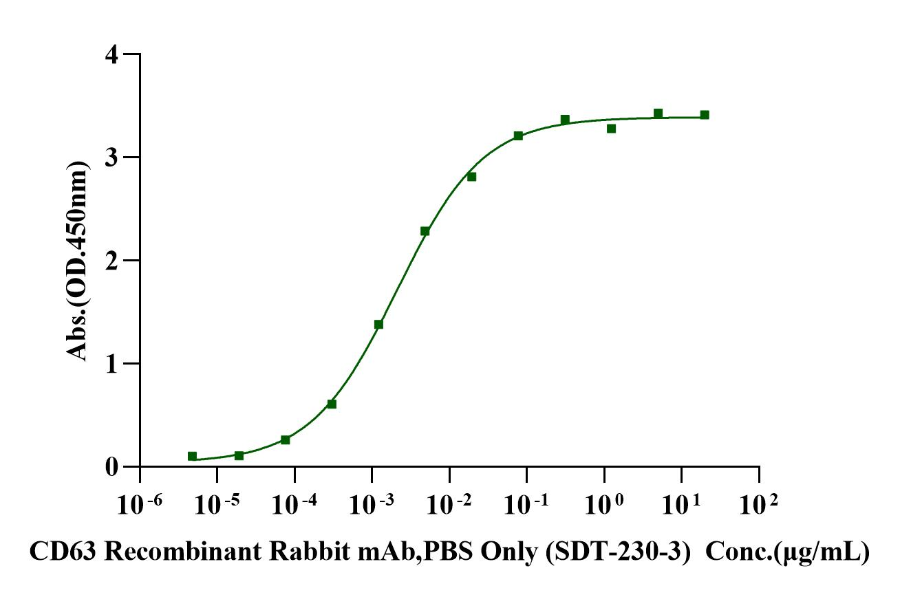Immobilized CD63 Fc Chimera Protein, Human (Cat. No. UA010511) at 2μg/mL (100μL/well) can bind CD63 Recombinant Rabbit mAb,PBS Only (SDT-230-3) (Cat. No. S0B2141P) with EC50 of 1.78-2.51ng/ml.