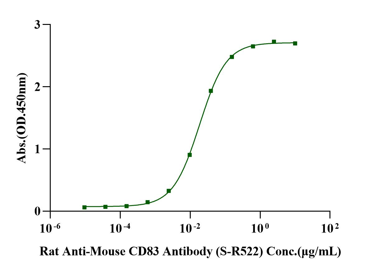 Immobilized CD83 Fc Chimera Protein, Mouse (Cat. No. UA010549) at 2μg/mL (100μL/well) can bind Rat Anti-Mouse CD83 Antibody (S-R522) (Cat. No. S0B1134) with EC50 of 17.61-19.81ng/ml.