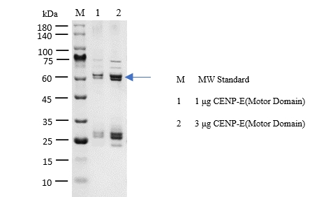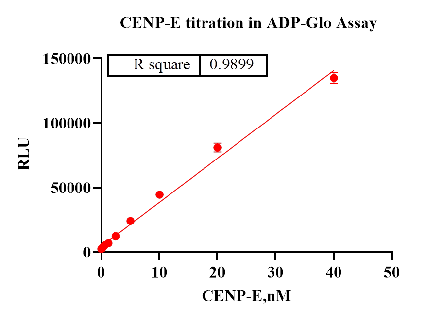 The CENP-E(Motor Domain) activity was detected using Ultra Luminescence technology. The reaction was performed by incubating the CENP-E(Motor Domain) protein, ATP and substrate at 25℃ for 60 min, then adding ADP-Glo reagent and reading RLU with BMG.