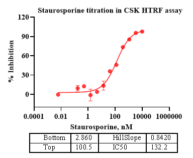 The CSK activity was detected using HTRF technology. The reaction was performed by incubating the CSK protein, ATP and substrate at 25℃ for 60 min, then reading ratio 665/620 with BMG.