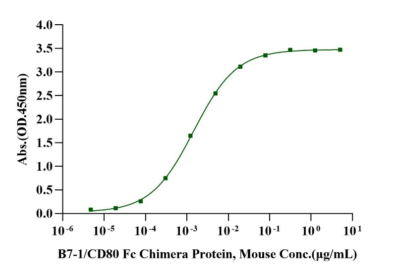Immobilized CTLA-4/CD152 His Tag Protein, Rat (Cat. No. UA010792) at 2.0μg/mL (100μL/well) can bind B7-1/CD80 Fc Chimera Protein, Mouse (Cat. No. UA011080)  with EC50 of 1.36-1.57ng/mL.