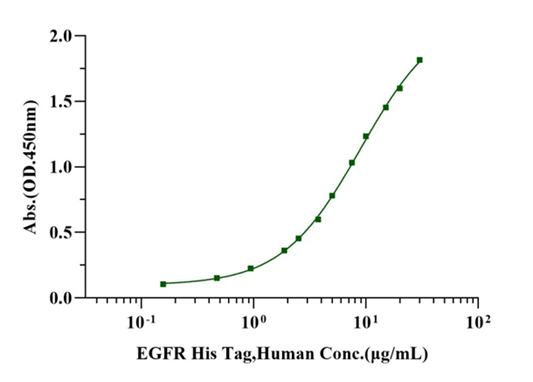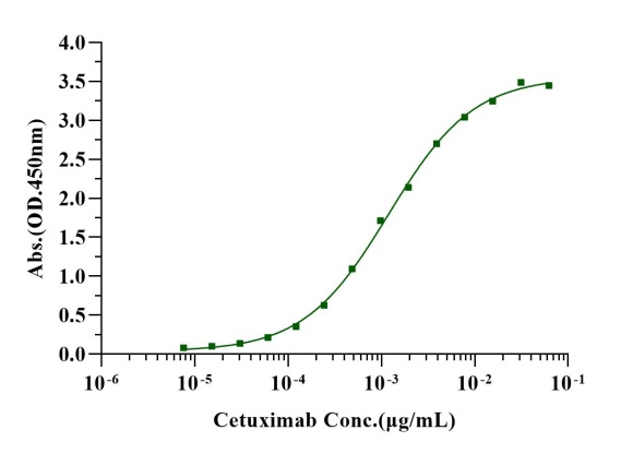 Immobilized EGFR His Tag, Human (Cat. No. UA010306) at 0.5μg/mL (100μL/well) can bind Cetuximab (starter-bio, Cat. No. S0B0429) with EC50 of 1.07-1.33 ng/mL.