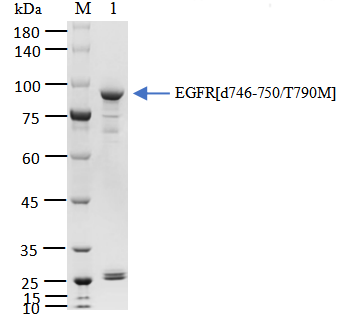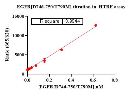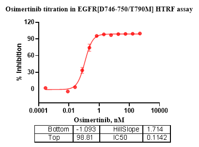 The EGFR[d746-750/T790M] activity was detected using HTRF technology. The reaction was performed by incubating the EGFR[d746-750/T790M] protein, ATP and substrate at 25℃ for 60 min, adding the beads at 25℃ for 60 min, then reading ratio 665/620 with BMG.