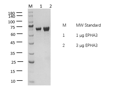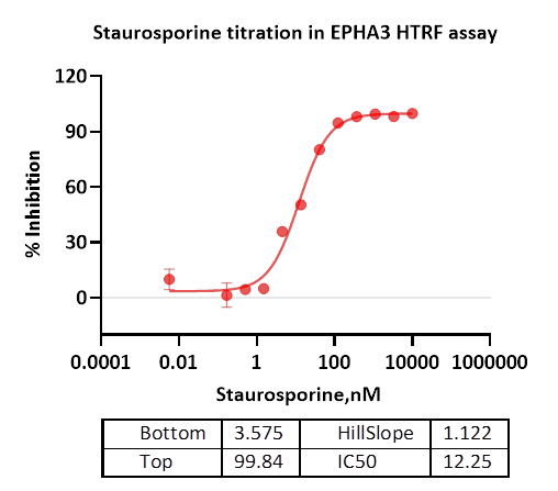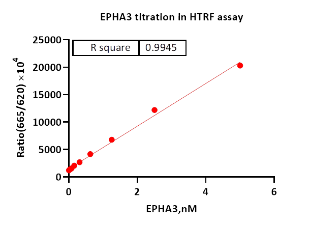 The EPHA3 activity was detected using homogeneous time-resolved fluorescence technology. The reaction was performed by incubating the EPHA3 protein , ATP and substrate at 25℃ for 50 min, adding the TK-mix at 25℃ for 60 min, then reading ratio 665/620 nm with BMG.
