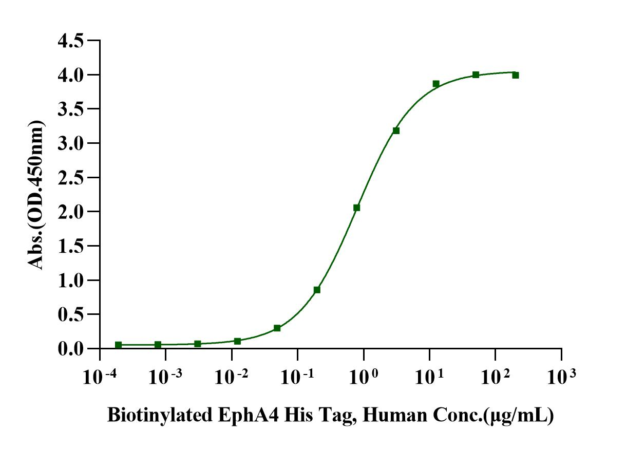 Immobilized Ephrin-A4 His Tag, Human (Cat. No. UA010154) at 5.0μg/mL (100μL/well) can bind Biotinylated EphA4 His Tag, Human with EC50 of 0.73-0.86μg/mL.