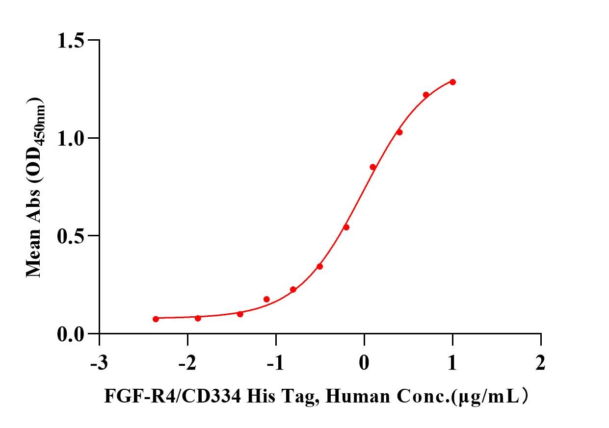 Immobilized FGF-basic(154aa), Human (Cat. No. UA040007) at 1μg/mL (100μL/well) can bind FGF-R4/CD334 His Tag, Human (Cat. No. UA020009) with EC50 of 0.968μg/mL.