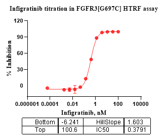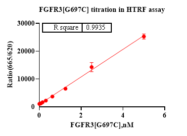 The FGFR3[G697C] activity was detected using HTRF technology. The reaction was performed by incubating the FGFR3[G697C] protein, ATP and substrate at 25℃ for 60 min, adding the beads at 25℃ for 60 min, then reading ratio 665/620 with BMG.