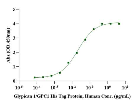 Immobilized FGF-basic(154aa) Protein, Human (Cat. No. UA040007) at 2.0μg/mL (100μL/well) can bind Glypican 1/GPC1 His Tag Protein, Human (Cat. No. UA011160) with EC50 of 17.56-25.93ng/mL.