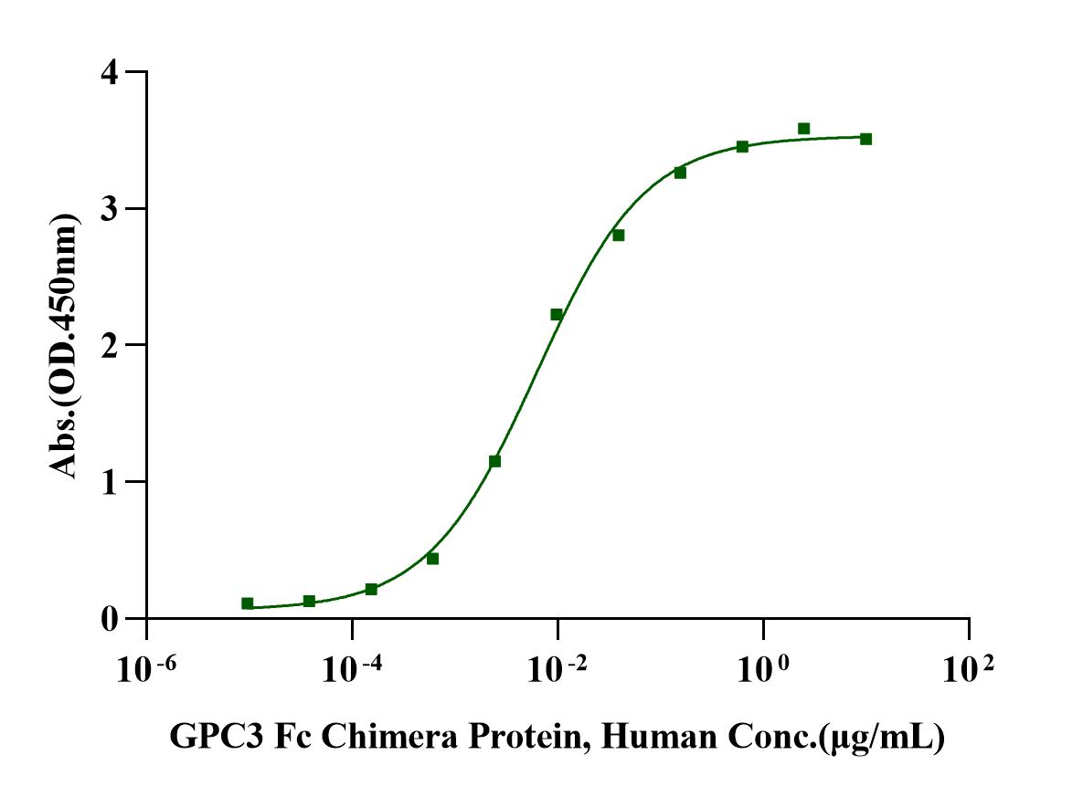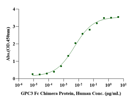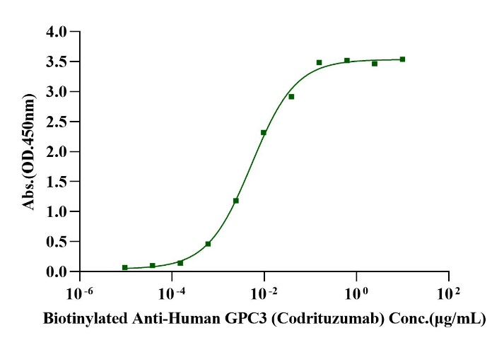 Immobilized GPC3 Fc Chimera, Human (Cat. No. UA010680) at 2.0μg/mL (100μL/well) can bind Biotinylated Anti-Human GPC3 (Codrituzumab) with EC50 of 4.39-6.54ng/mL.