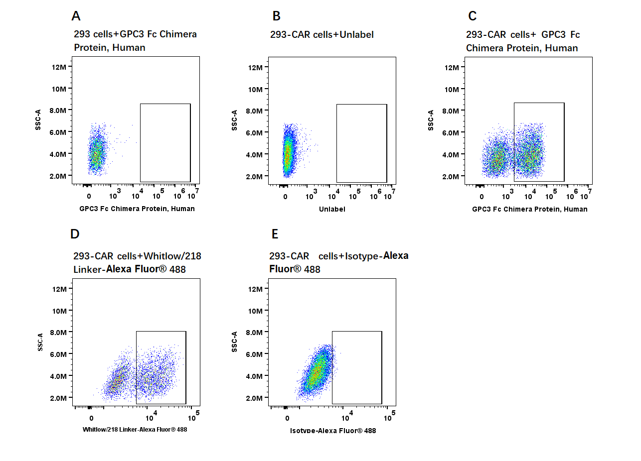 2e5 of transient transfected anti-GPC3 ScFv CAR-293 cells were stained with 0.01ug GPC3 Fc Chimera Protein, Human, (Cat. No. UA010680) and unlable respectively (Fig. C and B), and non-transfected 293 cells were used as a control (Fig. A). Alexa Fluor 647 signal was used to evaluate the binding activity. 2e5 of transient transfected anti- GPC3 ScFv CAR-293 cells were stained with isotype and Whitlow/218 Linker-Alexa Fluor® 488 (Fig. D and E). Alexa Fluor® 488 signal was used to evaluate the binding activity.