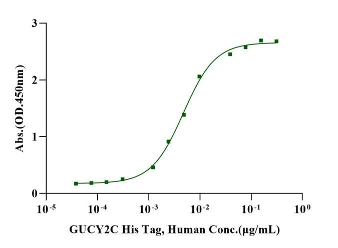 Immobilized Anti-Human GUCY2C Monoclonal Antibody at 2μg/mL (100μL/well) can bind GUCY2C His Tag, Human (Cat. No. UA010185) with EC50 of 4.26-5.38ng/ml.