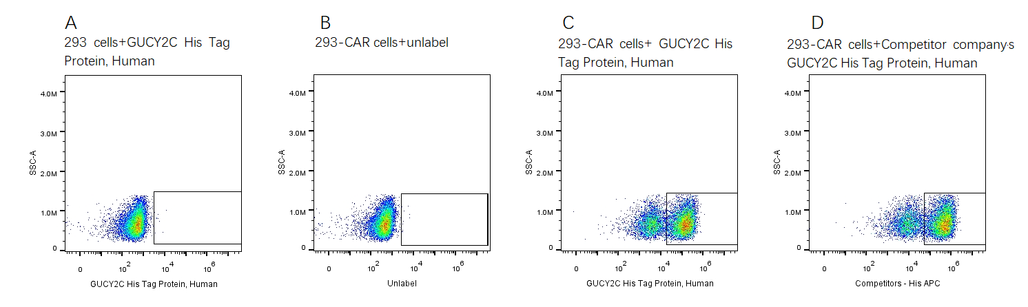 2e5 of transient transfected anti-GUCY2C ScFv CAR-293 cells were stained with 0.1ug GUCY2C His Tag Protein, Human, (Cat. No. UA010185) and unlable respectively (Fig. C and B), and non-transfected 293 cells were used as a control (Fig. A). Alexa Fluor 647 signal was used to evaluate the binding activity. 2e5 of transient transfected anti- GUCY2C ScFv CAR-293 cells were stained with competitor respectively (Fig.D). APC signal was used to evaluate the binding activity.