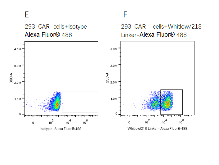 2e5 of transient transfected anti- GUCY2C ScFv CAR-293 cells were stained with isotype and Whitlow/218 Linker-Alexa Fluor® 488 (Fig. E and F). Alexa Fluor® 488 signal was used to evaluate the binding activity.