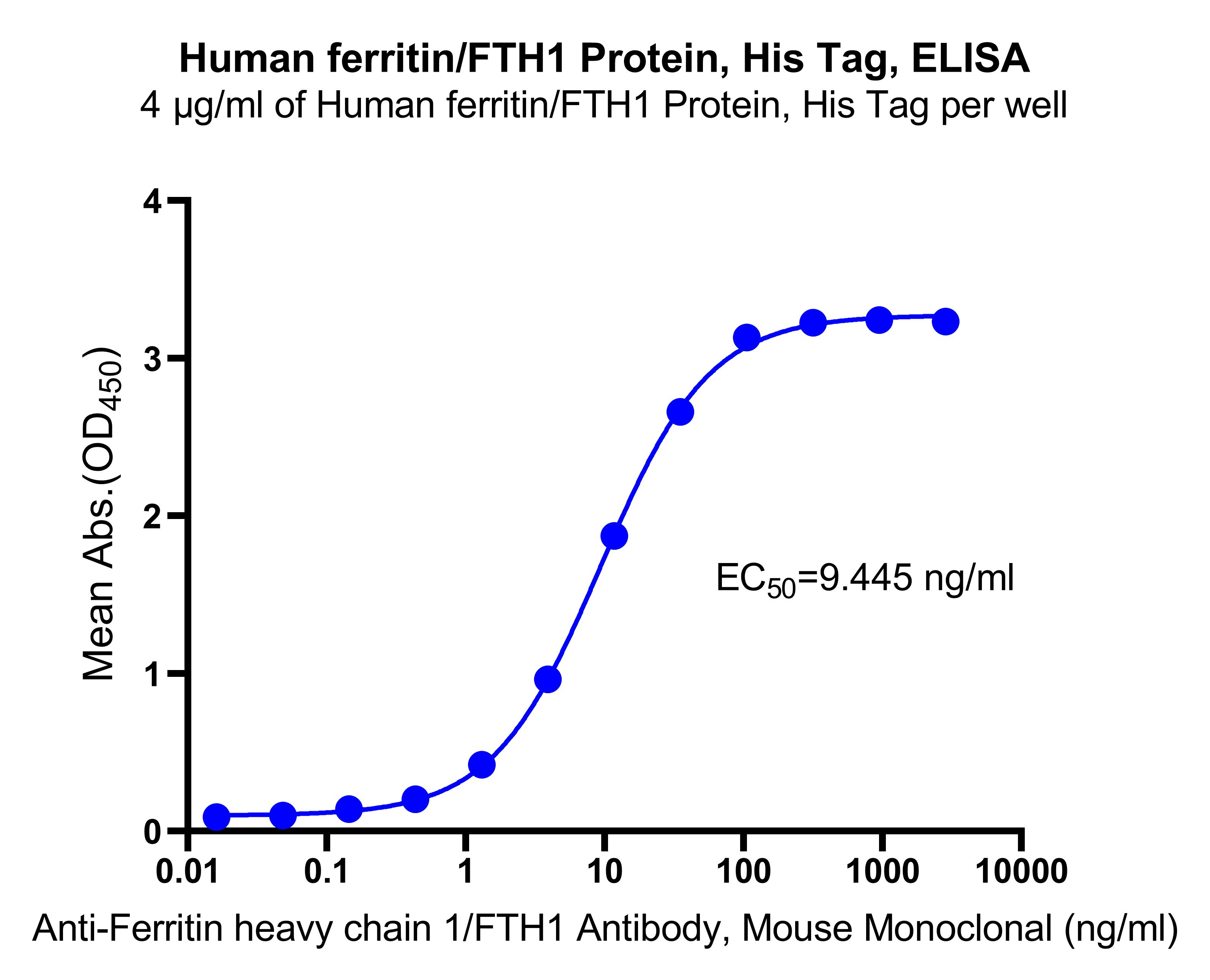 Immobilized Human ferritin/FTH1 Protein, His Tag at 4 μg/mL (50 μL/well) can bind Anti-Ferritin heavy chain 1/FTH1 Antibody, Mouse Monoclonal with EC50 of 8.877-10.05 ng/ml.