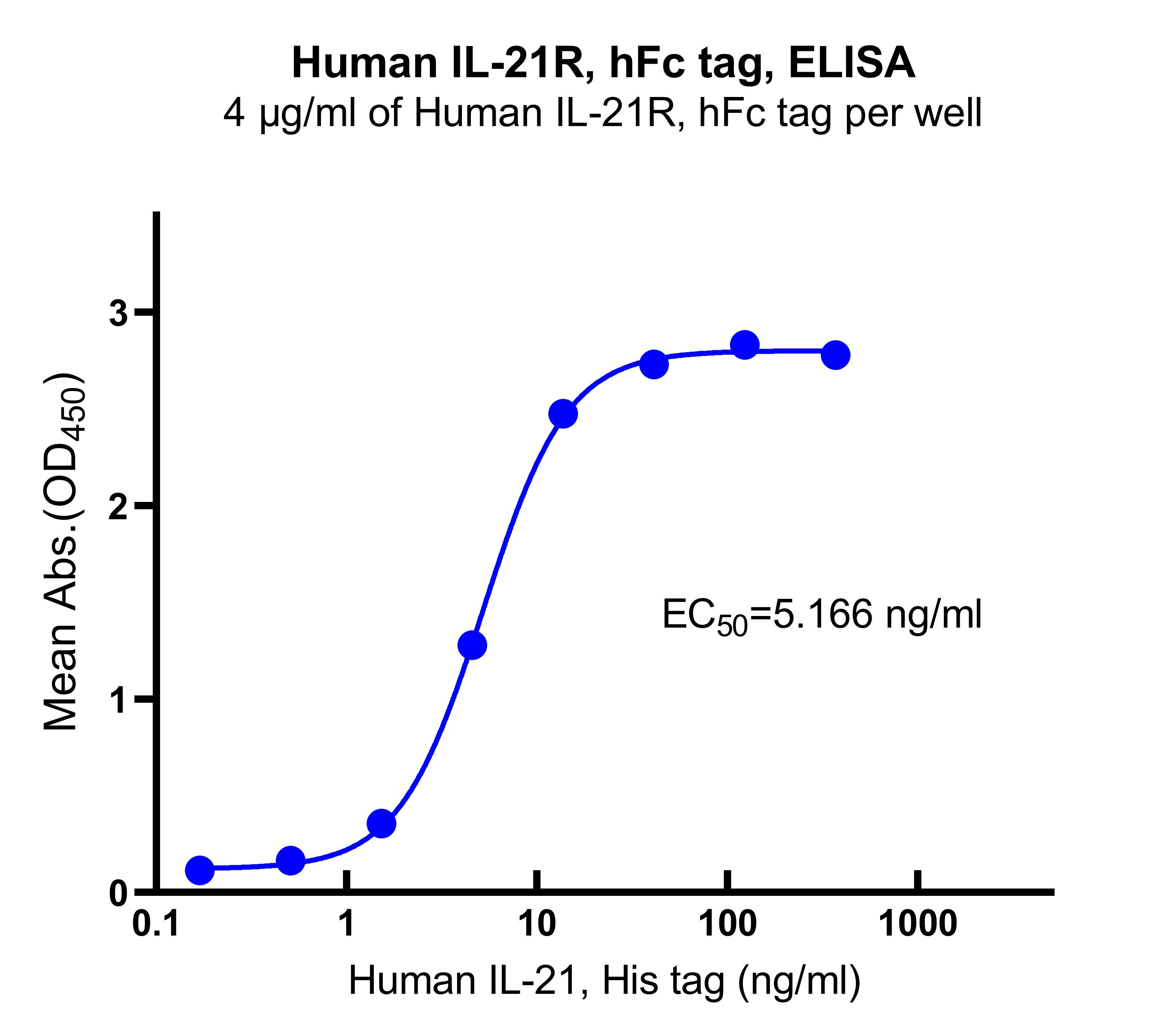 Immobilized Human IL-21R, hFc tag at 10 μg/mL (50 μL/well) can bind Human IL-21, His tag (Cat. No. S0A4042) with EC50 of 4.878-5.470 ng/ml.