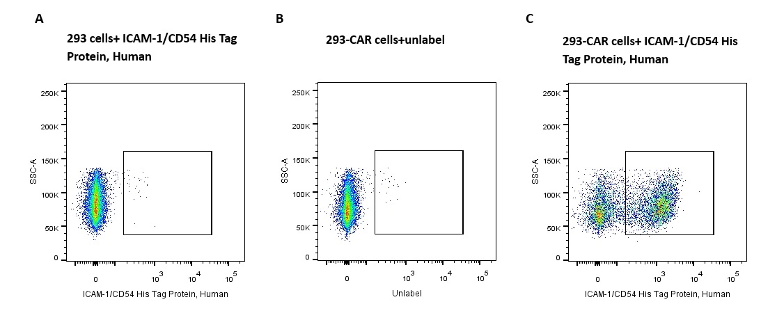 2e5 of transient transfected anti-ICAM-1 ScFv CAR-293 cells were stained with 0. 1ug ICAM-1/CD54 His Tag Protein, Human, (Cat. No. UA010179) and unrelated protein (Fig. C and C and B), and non-transfected 293 cells were used as a control (Fig. A). APC signal was used to evaluate the binding activity.