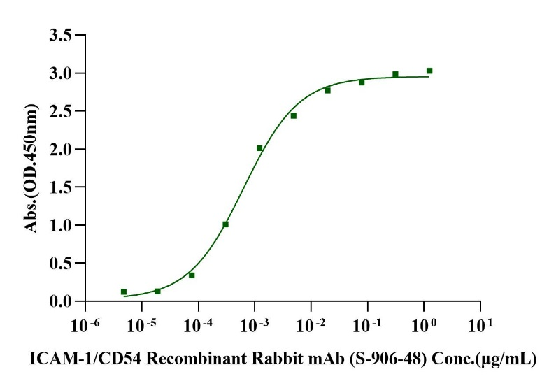 Immobilized ICAM-1/CD54 His Tag, Human (Cat. No. UA010179) at 2.0μg/mL (100μL/well) can bind ICAM-1/CD54 Recombinant Rabbit mAb (S-906-48) (S-1233-25) (Cat. No. S0B0795)  with EC50 of 0.46-0.87ng/mL.