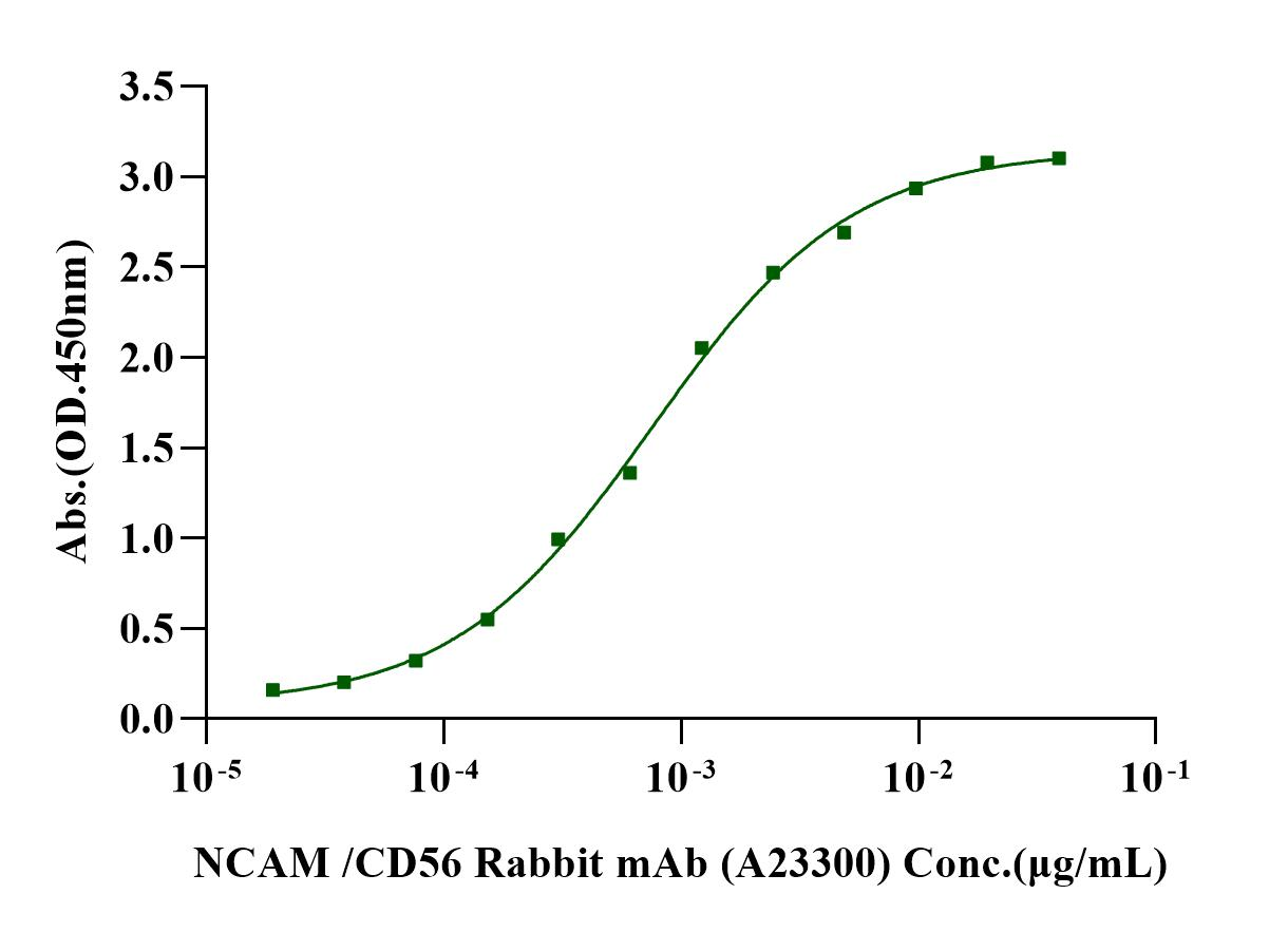 Immobilized NCAM-1/CD56 His Tag Protein, Mouse (Cat. No. UA010307) at 1.0μg/mL (100μL/well) can bind NCAM /CD56 Rabbit mAb (A23300) with EC50 of 0.66-0.86 ng/mL.